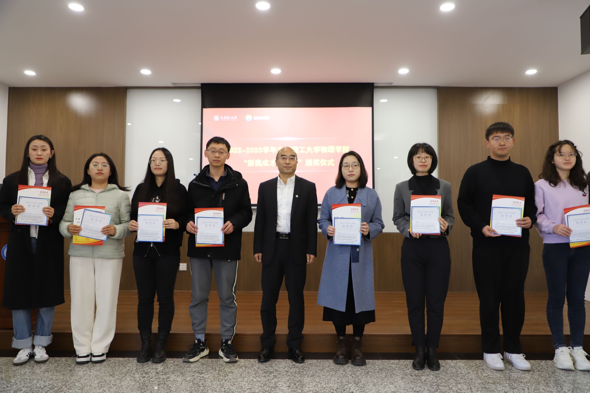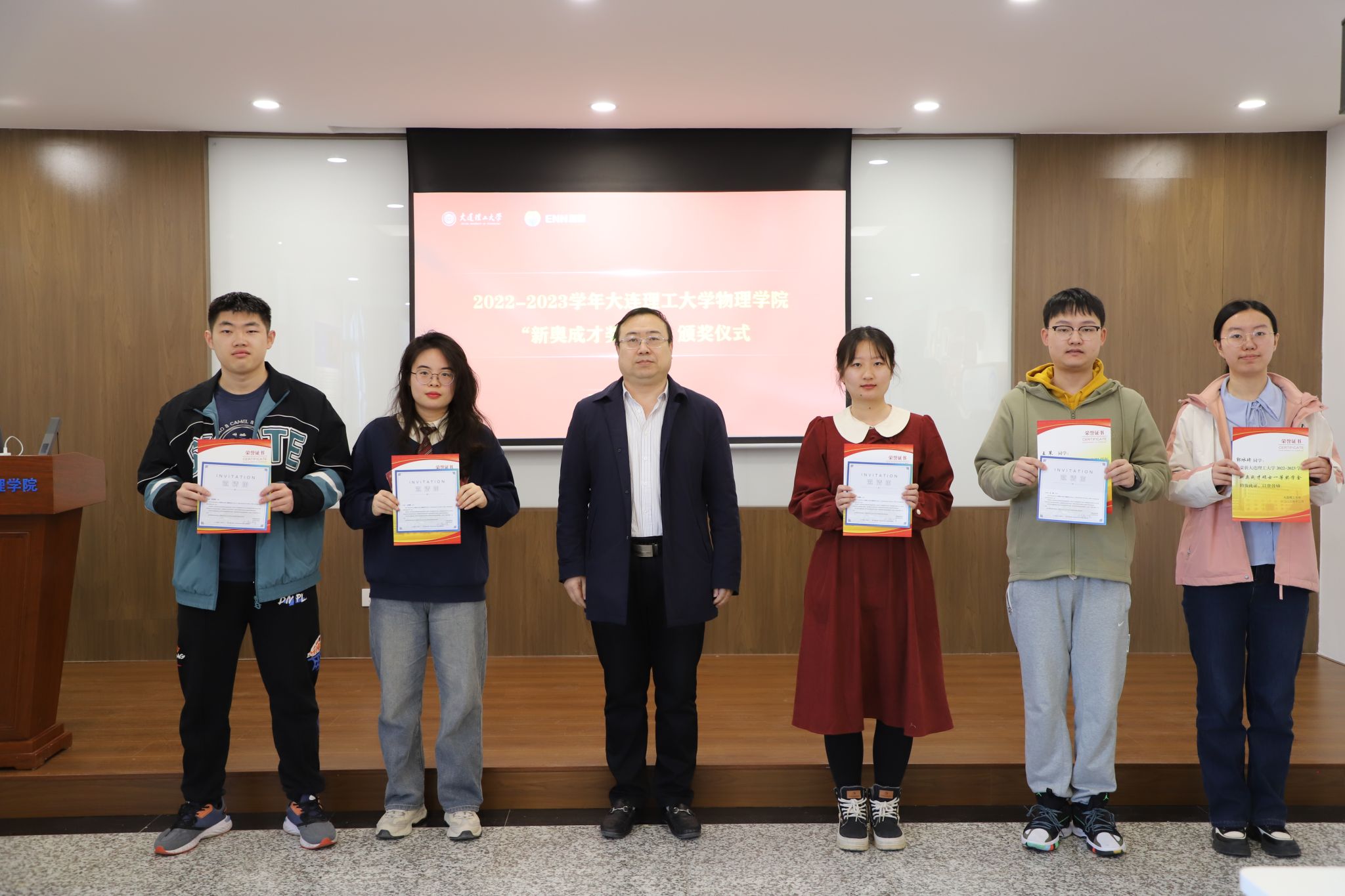 捐赠仪式结束后,举行了2022-2023年“新奥成才奖学金”颁奖仪式。刘敏胜院长和物理学院党委书记于长水为获奖学生颁奖。
