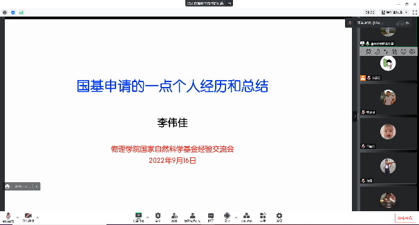9月16日物理学院召开国家自然科学基金申报交流会,9月8日国家自然科学基金委公布了今年国家自然科学基金的资助名单,物理学院共获批20项国家自然科学基金项目,今年我院面上申报资助总数成果喜人,为了保持学院申报资助良好态势,提高我学院国家自然科学基金申报获批率,学院科研副院长高飞教授牵头邀请了蒋雪、李伟佳、张信普三位教师进行国家自然科学基金面上申请的经验交流,解读撰写基金申报书应注意的要点,如何在众多申报书中更加具有竞争力。我院青年教师积极参会。