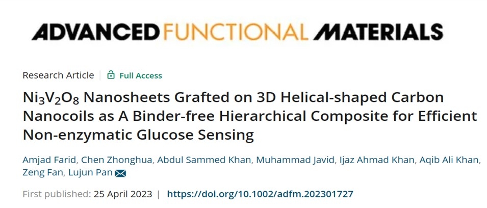 近日,我校物理学院潘路军教授课题组在高效葡萄糖检测的新型非酶葡萄糖传感器(NEGS)研究上取得突破性进展,相关成果“Ni3V2O8Nanosheets Grafted on 3D Helical-shaped Carbon Nanocoils as A Binder-free Hierarchical Composite for Efficient Non-enzymatic Glucose Sensing”在国际期刊Advanced Functional Materials上发表。研究成果对于定量、可靠的葡萄糖检测、糖尿病管理以及生物技术、制药、食品加工等领域都具有重要意义。