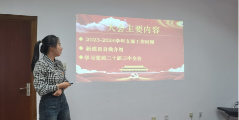 大会第一项,党支部书记杨秋萍同志作党支部工作汇报。首先对党支部概况进行了基本介绍。接着带领各位党员同志对过去一年党支部的工作作了回顾与总结。支部严格落实三会一课制度,举办特色主题党日活动,联系与发展党员,积极推动党员发展工作。支部成员充分发挥先锋模范作用,数名同志在评奖评优中表现突出。杨秋萍同志表示,成绩属于过去,未来任重道远,希望所有同学都能够以崭新的面貌迎接新学年,以更加振奋的精神、更加高昂的斗志迎接新一年的挑战。