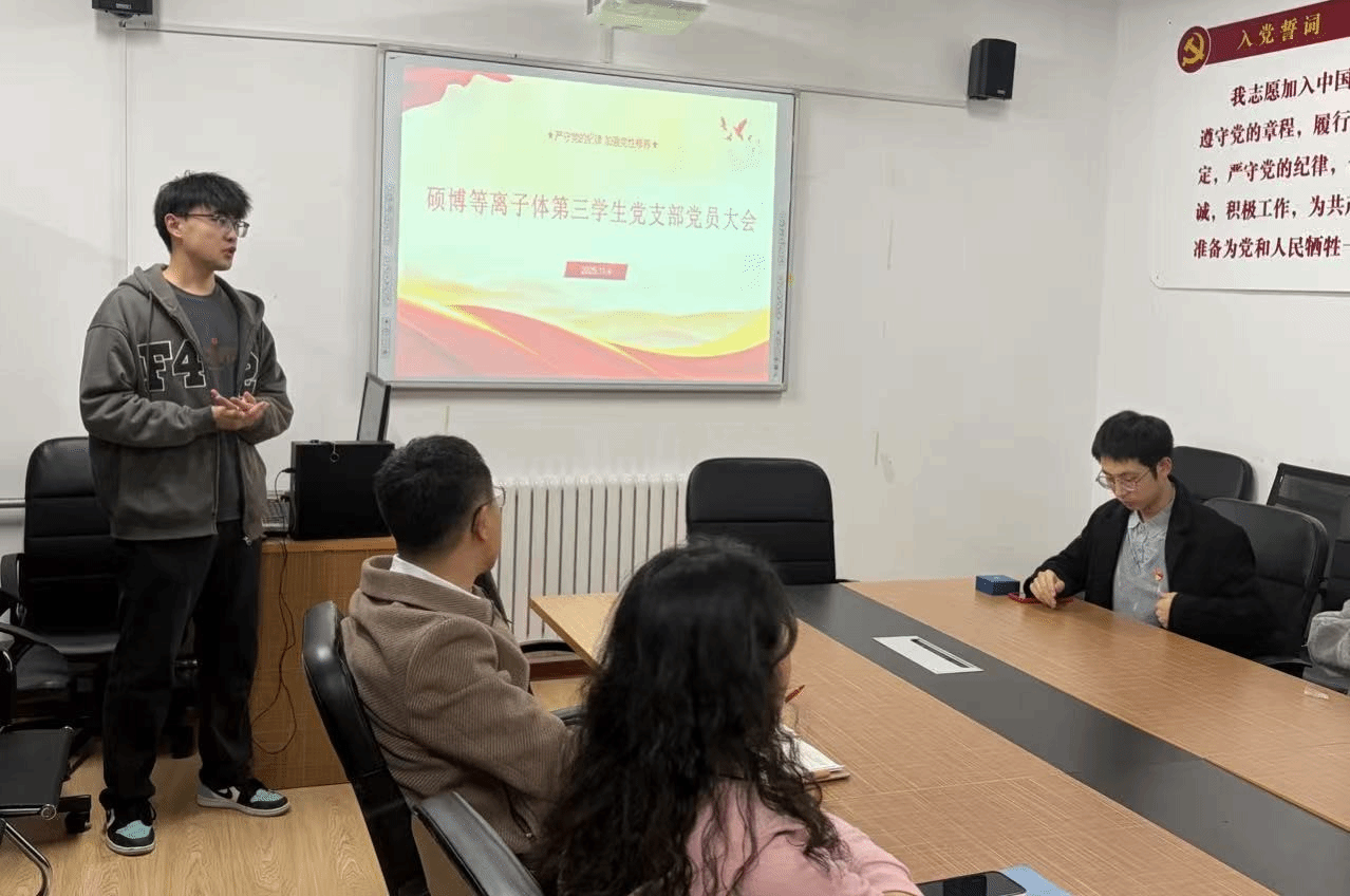 为深入学习贯彻谢春涛同志“中华人民共和国与中华民族伟大复兴”专题党课精神,巩固学习成果,物理学院硕博等离子体第三学生党支部于2025年11月4日19:45在物理学院422会议室召开主题研讨会。本次会议由党支部书记高子豪同志主持,物理学院院长王正汹老师列席指导。