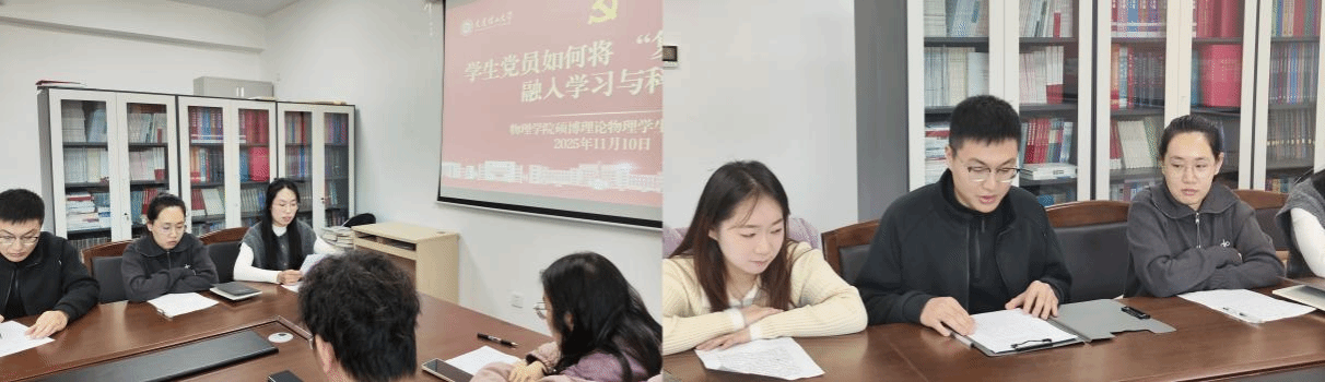 为深入贯彻上级党组织关于党员教育培训的重要部署,深化党支部党员集中培训的阶段性成效,深刻领会谢春涛教授“中国共产党与中华民族伟大复兴”主题党课的核心要义,2025年11月10日中午12:30,物理学院硕博理论物理学生党支部在厚民楼(马院)414会议室召开全校第二次党员基本培训主题研讨会,本次研讨会的主题是“学生党员如何将复兴目标融入学习与科研”。会议由党支部宣传委员聂文慧同志主持,特邀物理学院党委书记于长水教授莅临指导,党支部全体党员参加会议。