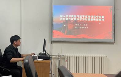 2023年6月7日,物理学院硕博等离子体第二学生党支部于物理楼422召开党员大会。会议由党支部书记段蒙悦同志主持。大会的主要内容包括物理学院副院长高飞老师讲党课、学习贯彻习近平总书记在中央政治局第五次集体学习时的重要讲话精神和支委补选三项内容。