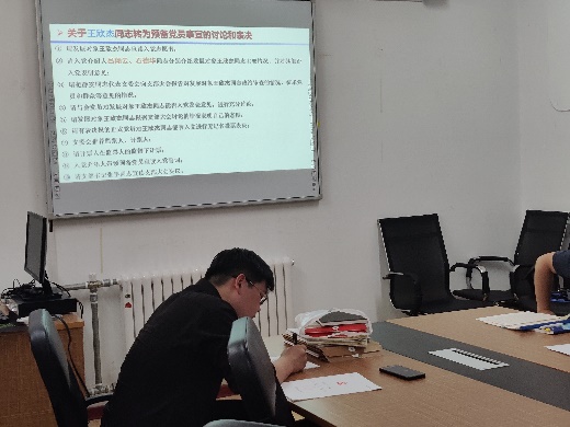 会议第二项,对惠得轩等六名预备党员转正事宜依次进行讨论和表决。根据党支部发展党员计划,经征求党员、群众意见,支部委员会审查同意,召开此次预备党员转正大会。大会严格按照程序进行预备党员转正议题。预备党员惠得轩、相垚君、张贤、李欣阳、周杨、黄高煌六名同志依次宣读了转正申请,汇报了预备期间的思想理论学习、工作生活情况。接下来,按照程序由各自的入党介绍人分别介绍对于六位同志的考察情况,并提出了同意转正的意见。随后,组织委员范静雯同志代表支委会分别宣读六位同志按期转正的考察意见。到会党员也分别对六位预备党员一年来的表现进行了客观、认真的评价,肯定他们在预备期间在各个方面上的提高,认为他们已经具备了成为正式党员的素质,并对其今后的工作提出了意见和希望。经过全体与会正式党员投票表决,一致通过张贤等六位同志按期转为中共正式党员。六位同志认真听取意见与建议,纷纷表示在今后的学习生活中将会更加严格地要求自己,发挥党员先锋模范作用。