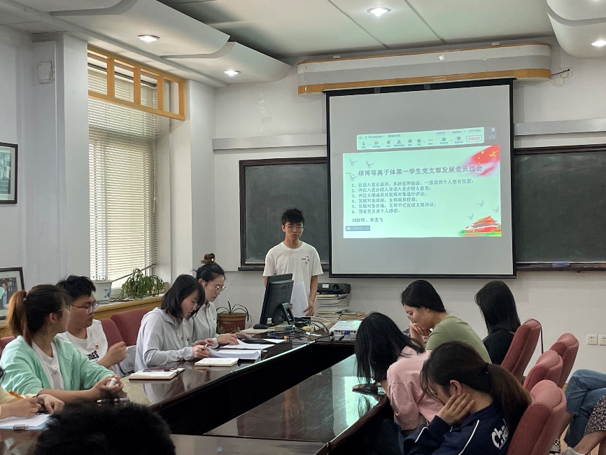 为加强党员队伍建设,积极推进党员发展工作,健全完善机制,发挥党支部的战斗堡垒作用。按照学院党委统一部署并报党委批准,经硕博等离子体第一学生党支部支委会研究,物理学院硕博等离子体第一学生党支部于2023年6月12日在三束一号楼205室召开党员大会。大会主要内容包括讨论刘世明同志和李龙飞同志的入党过会以及支部委员述职,会议由党支部书记崔紫宵主持,支部全体党员均到会参与。
