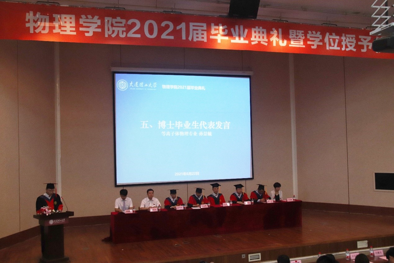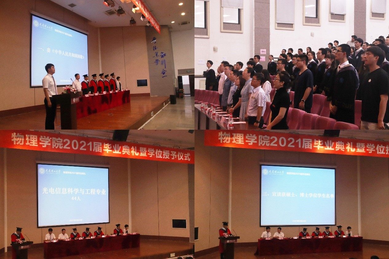 随着中华人民共和国国歌的奏响,毕业典礼拉开帷幕。副院长于长水教授宣读物理学院2021届授予学士学位的学生名单、副院长陈茂笃教授宣读物理学院2021届授予硕士、博士学位学生名单。
