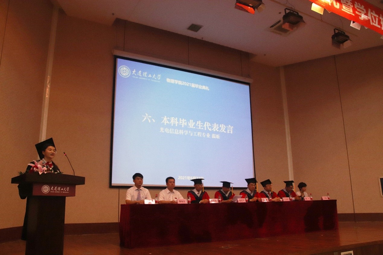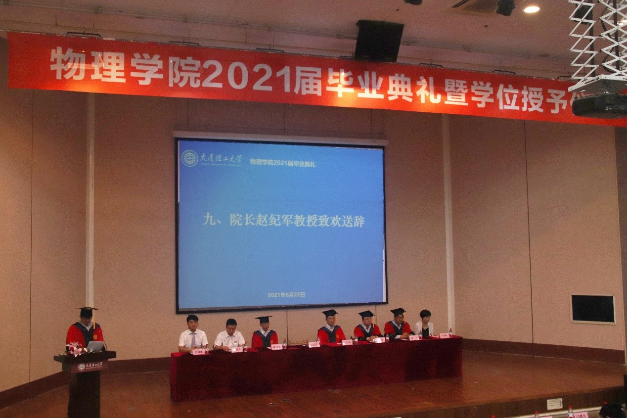 仲夏时节,万类竞秀,这是大工物理人收获的季节,也是告别的季节。在这感慨万千的时刻,物理学院院长赵纪军教授向2021届毕业生表示最衷心的祝贺与最真诚的祝福,以及对辛勤培育学生的老师们的表示感谢。赵院长对过去五年间物理学院取得的优越成绩进行总结,并肯定和赞赏物理学院地红色基因和同学们的优良学风,深信大工物理的烙印将使同学们成为时代的建设者、开拓者、领跑者。