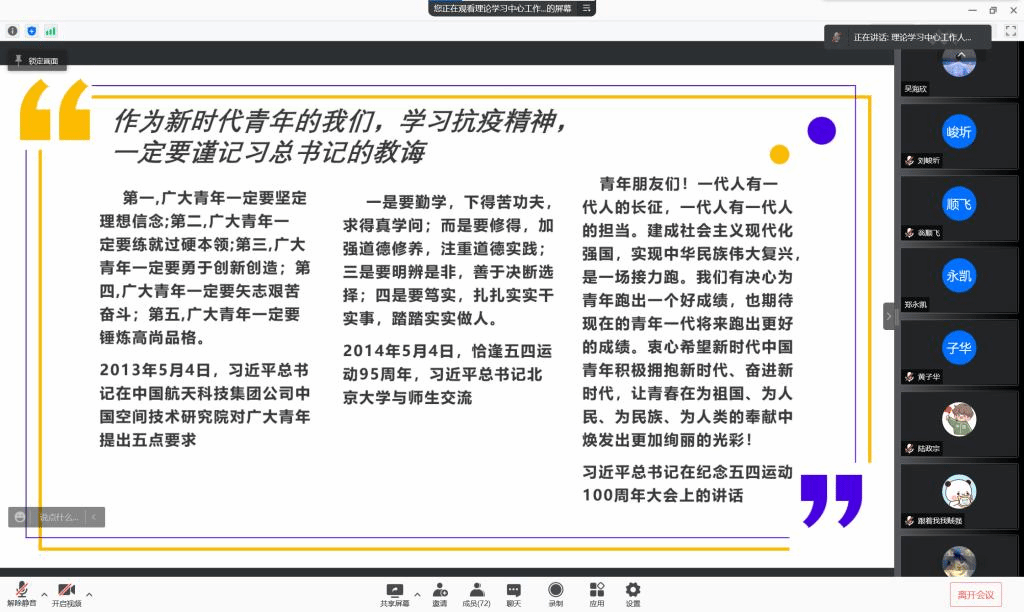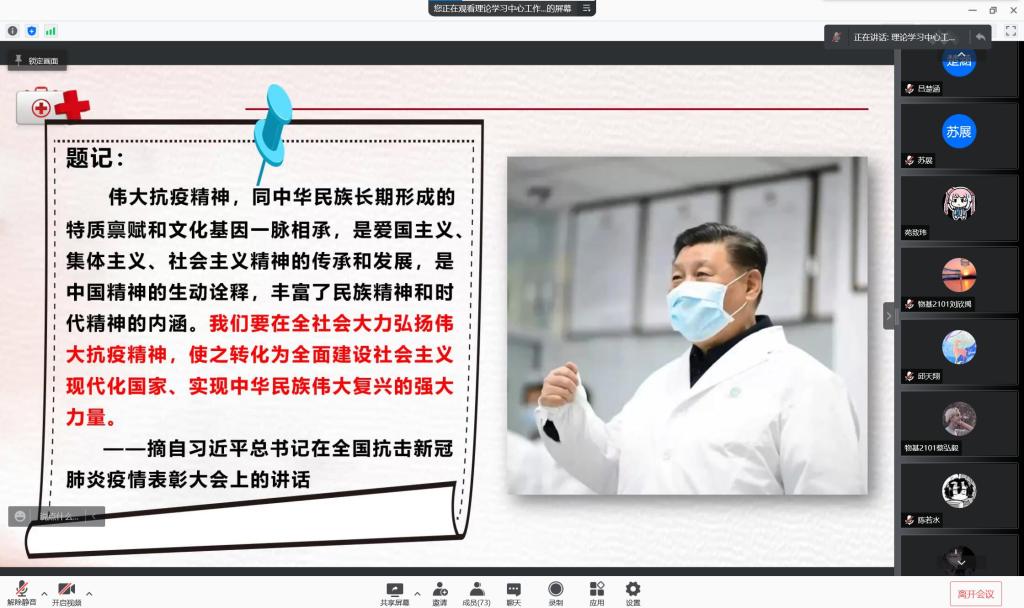 寒冬初至,疫情再次袭来,为学习防疫常识,弘扬抗疫精神,我们相约线上,召开了此次会议。本次宣讲会由来自理论宣传中心的孟令文同学主持,由邱志航同学和刘泽璇同学分别进行了宣讲,参加本次宣讲的还有物理学院大一全体同学。