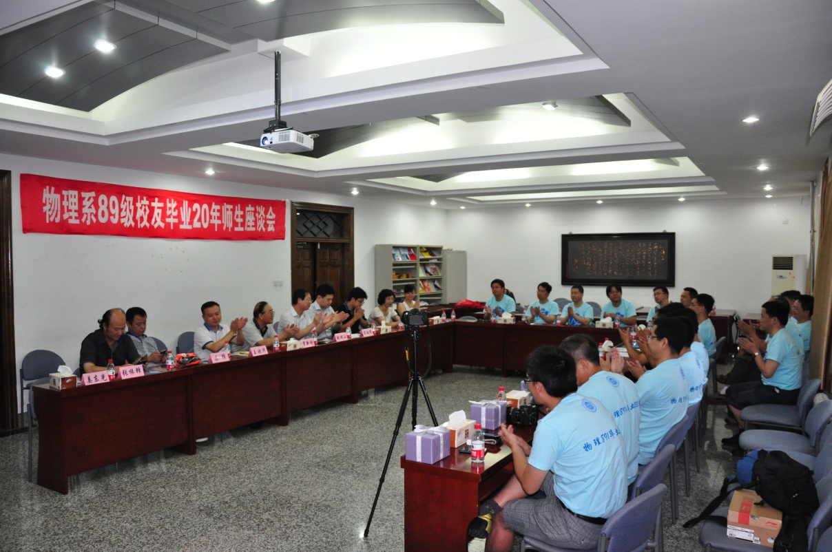 恳谈会由89级1班曾经的团支部书记解春禹主持,作为开场白,老支书与老班长共同发表了热情洋溢、声情并茂的返校感言。物理与光电工程学院院长赵明山教授代表全院师生对89级校友重返母校表示热烈欢迎,并向校友详细地介绍了学院和母校20年来取得的成绩。会上,现任北京创意博科技能源有限公司董事长的原班长邹怀松作为校友代表发言,对学校和学院的培养以及对本次返校活动的大力支持表示由衷感谢;同时,他宣布由物理89级全体校友共同设立了“物理89级校友基金”,主要面向物理与光电工程学院的优秀学生标兵设立专项奖学金,并对学院的物理嘉年华文化品牌活动予以支持,本次捐赠金额10万元。会上,翟刚军老师代表大连理工大学教育发展基金会接受了校友的捐助。